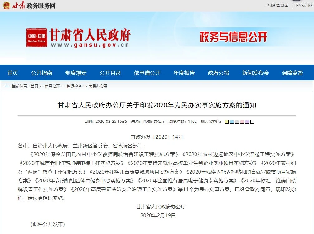 日前,甘肃省人民政府办公厅发布关于印发2020年为民办实事实施方案的通知,下发《2020年农村边远地区中小学温暖工程实施方案》(以下简称《实施方案》)等11个为民办实事方案。