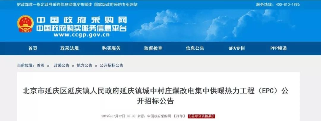 1.6亿,北京延庆镇煤改电空气源热泵集中供暖工程招标
