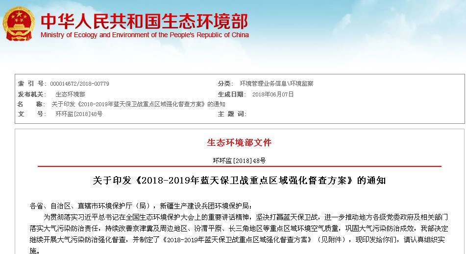 近日生态环境部发布了《2018-2019年蓝天保卫战重点区域强化督查方案》,在方案中指出为坚决打赢蓝天保卫战,进一步改善京津冀及周边地区、汾渭平原及长三角地区等重点区域(以下简称重点区域)环境空气质量,在“2+26”城市总体安排200个左右的督查组,汾渭平原11个城市总体安排90个左右的督查组,长三角地区以安排特别行动组为主,不定期对清洁取暖及燃煤替代、燃煤锅炉综合整治等情况进行督查。