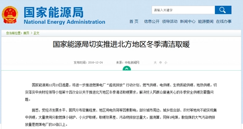 国家能源局12月23日透露,将进一步推进燃煤电厂“超低排放”行动计划、燃气供暖、电供暖、生物质能供暖、地热供暖,切实落实中央财经领导小组第十四次会议关于推进北方地区冬季清洁取暖要求,解决好人民群众普遍关心的冬季安全供暖及雾霾问题。