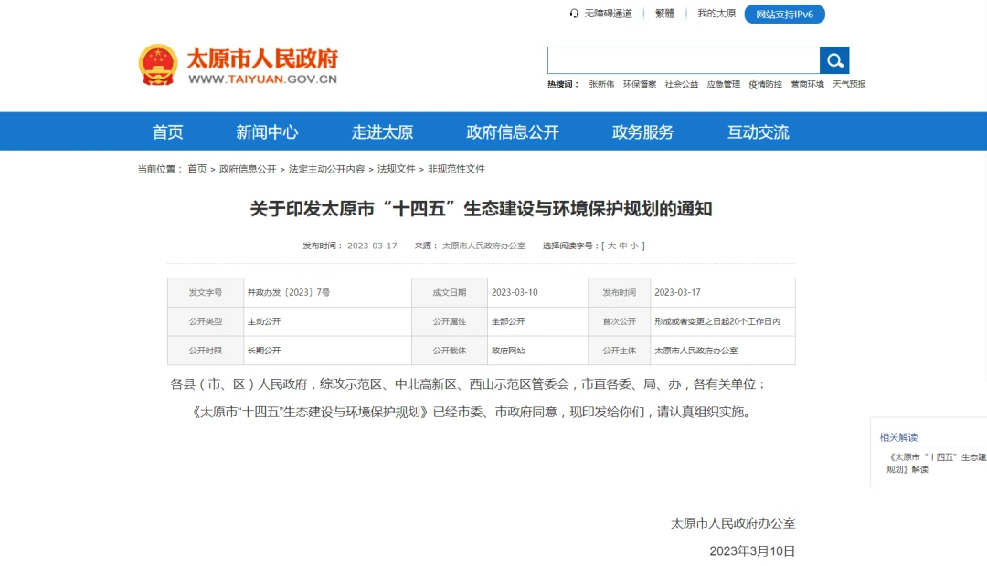 太原市人民政府关于印发太原市“十四五”生态建设与环境保护规划的通知。