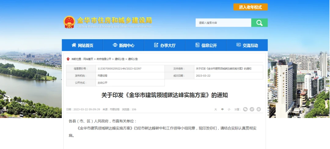 金华市住房和城乡建设局 发布关于印发《金华市建筑领域碳达峰实施方案》的通知。