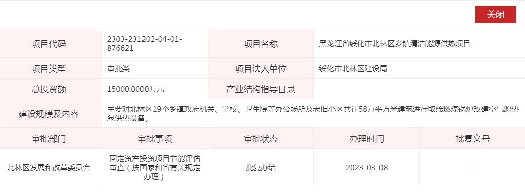 1.5亿,58万㎡!黑龙江北林区乡镇空气源热泵供暖项目获批