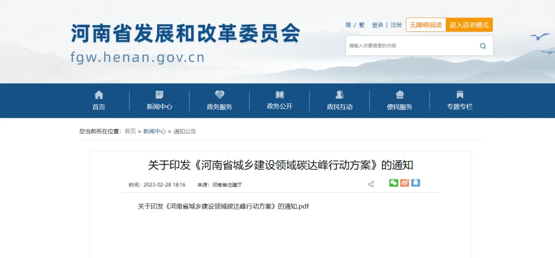 河南省发展和改革委员会关于印发《河南省城乡建设领域碳达峰行动方案》的通知。