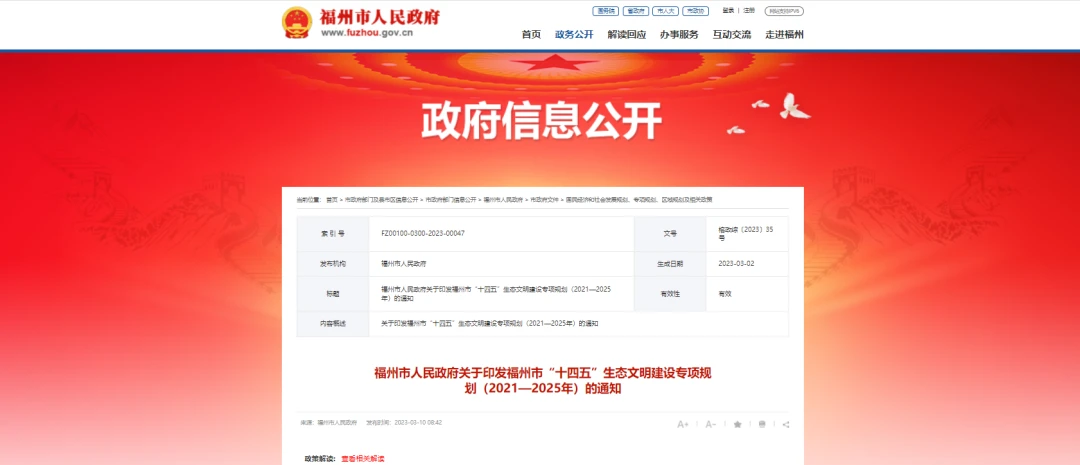 福州市人民政府关于印发福州市“十四五”生态文明建设专项规划(2021—2025年)的通知。