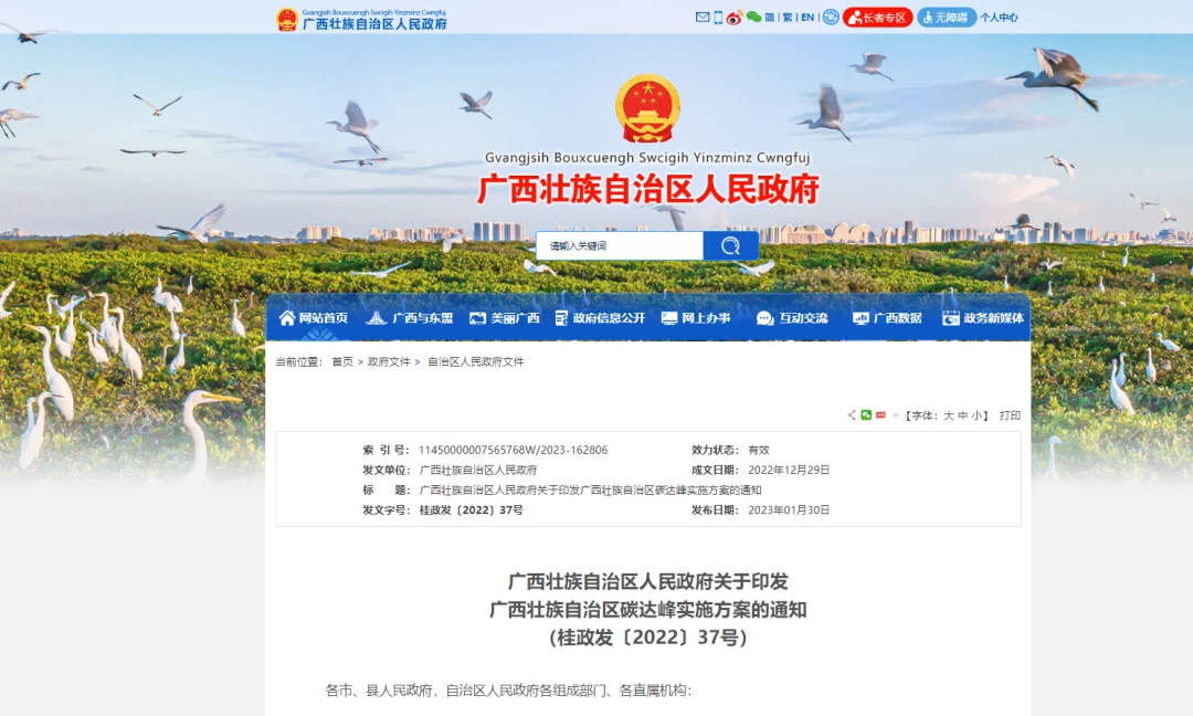 近日,广西壮族自治区人民政府关于印发广西壮族自治区碳达峰实施方案的通知。