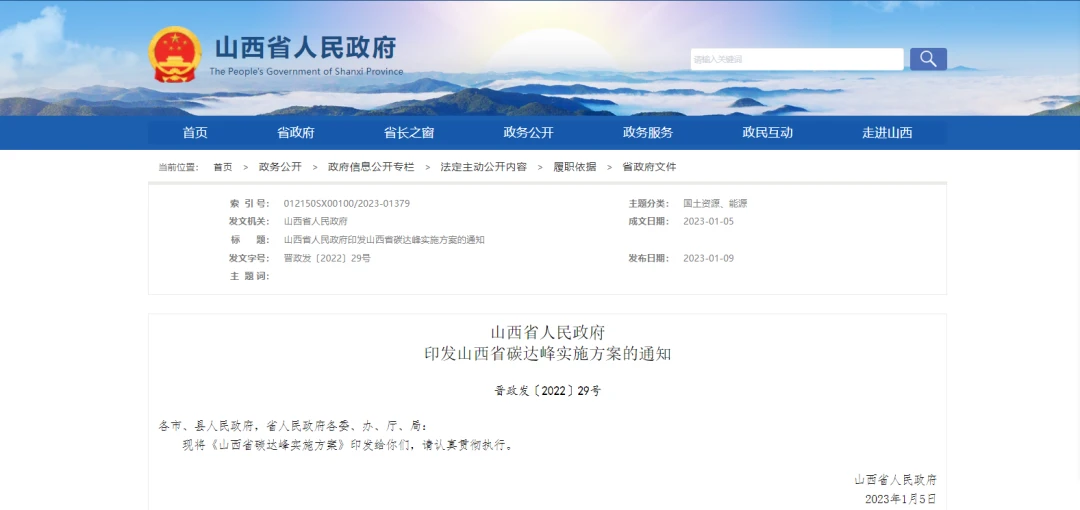 近日,山西省人民政府印发山西省碳达峰实施方案的通知。