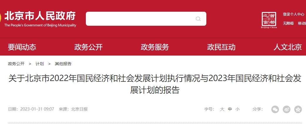 1月31日,北京市发改委发布《关于北京市2022年国民经济和社会发展计划执行情况与2023年国民经济和社会发展计划的报告》。报告中阐述了2023年北京市经济社会发展计划安排,及实现计划的十大主要任务和措施。