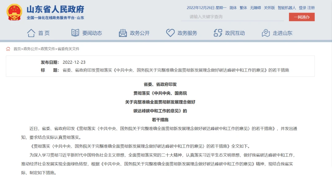 山东省委、省政府印发贯彻落实《中共中央、国务院关于完整准确全面贯彻新发展理念做好碳达峰碳中和工作的意见》的若干措施。