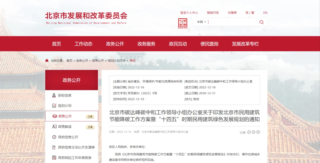 北京市碳达峰碳中和工作领导小组办公室印发北京市民用建筑节能降碳工作方案暨“十四五”时期民用建筑绿色发展规划的通知。