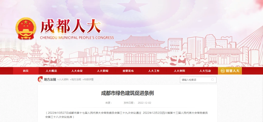 2022年12月2日,四川省十三届人大常委会第三十八次会议表决通过四川省人民代表大会常务委员会关于批准《成都市绿色建筑促进条例》的决定。