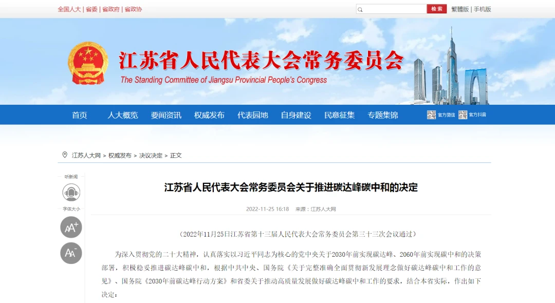 江苏省人民代表大会常务委员会发布关于推进碳达峰碳中和的决定。