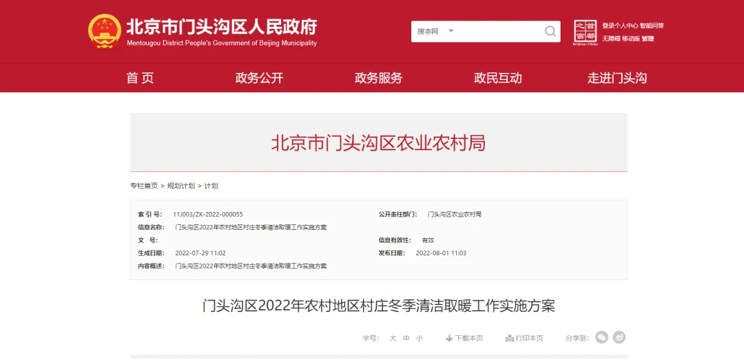 近日,北京市门头沟区农业农村局发布门头沟区2022年农村地区村庄冬季清洁取暖工作实施方案