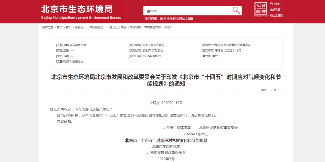 近日,北京市生态环境局北京市发展和改革委员会印发《北京市“十四五”时期应对气候变化和节能规划》的通知。