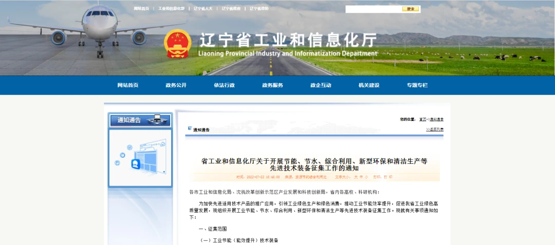近日,辽宁省工业和信息化厅关于开展节能、节水、综合利用、新型环保和清洁生产等先进技术装备征集工作的通知。