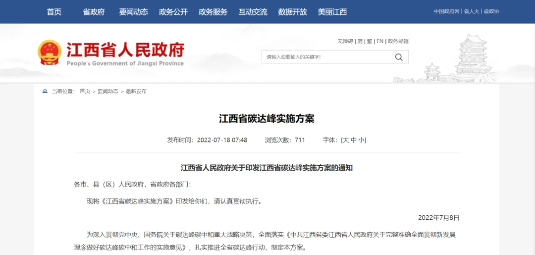 近日,江西省人民政府印发江西省碳达峰实施方案的通知。