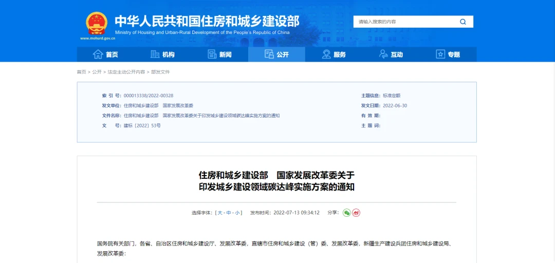 近日,住房和城乡建设部 国家发展改革委印发城乡建设领域碳达峰实施方案的通知。