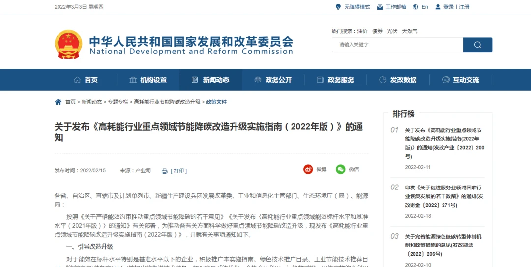近日,发改委发布《高耗能行业重点领域节能降碳改造升级实施指南(2022年版)》的通知。