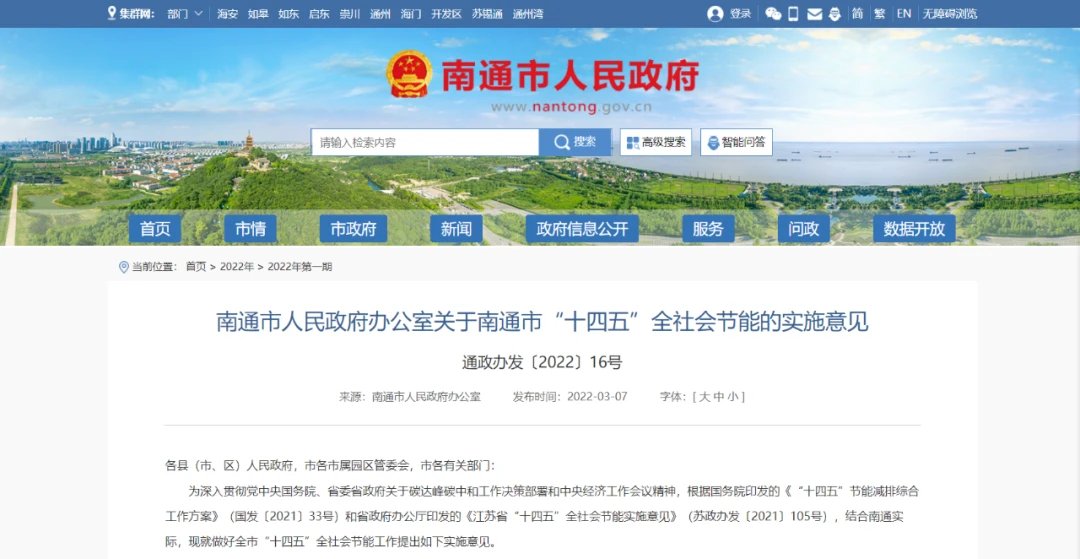 近日,南通市人民政府办公室关于南通市“十四五”全社会节能的实施意见。