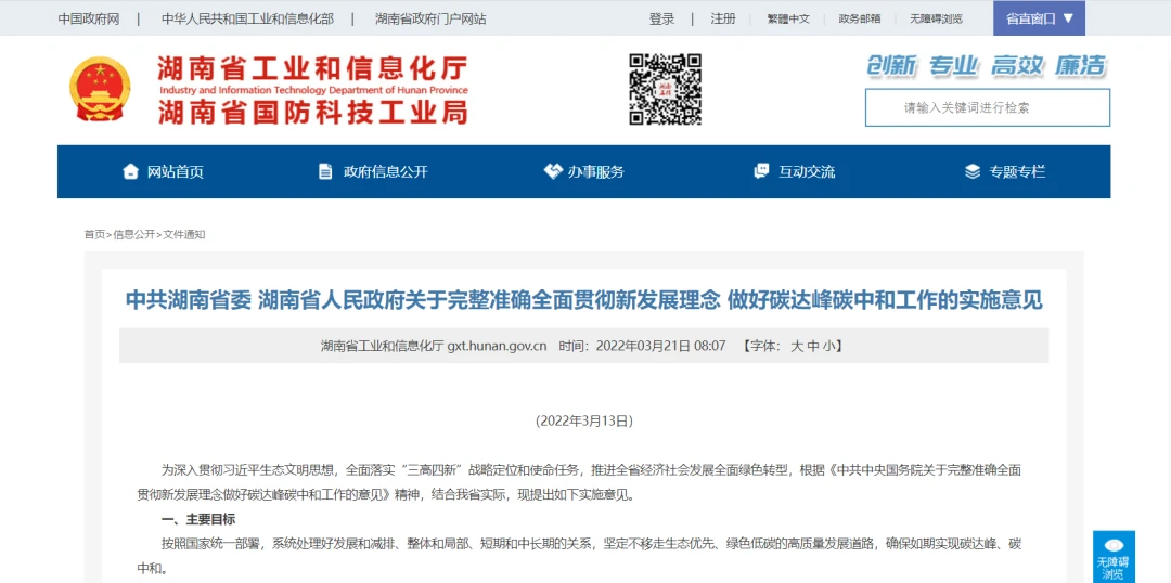 近日,中共湖南省委 湖南省人民政府发布关于完整准确全面贯彻新发展理念 做好碳达峰碳中和工作的实施意见。