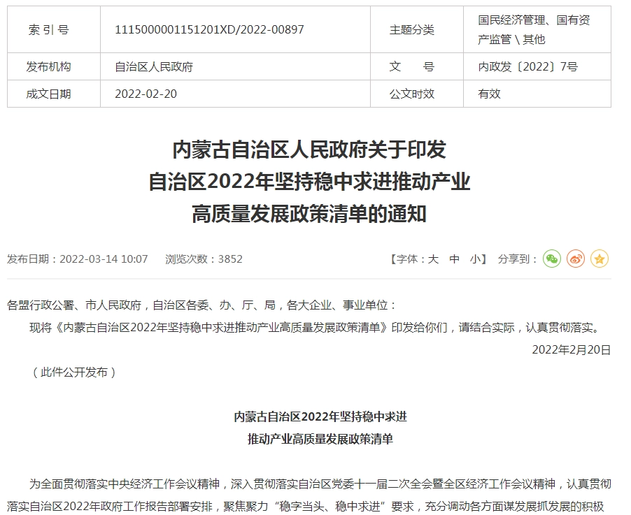 近期,内蒙古人民政府发布《内蒙古自治区人民政府关于印发自治区2022年坚持稳中求进推动产业高质量发展政策清单的通知》。