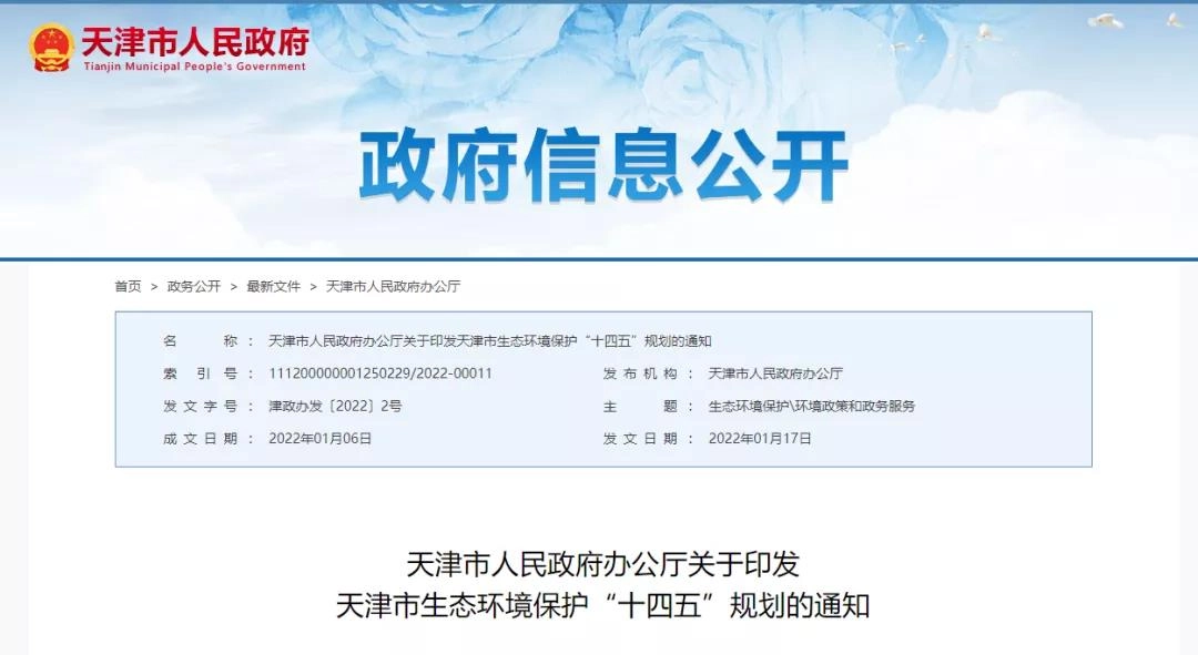近日,天津市人民政府办公厅印发天津市生态环境保护“十四五”规划的通知。