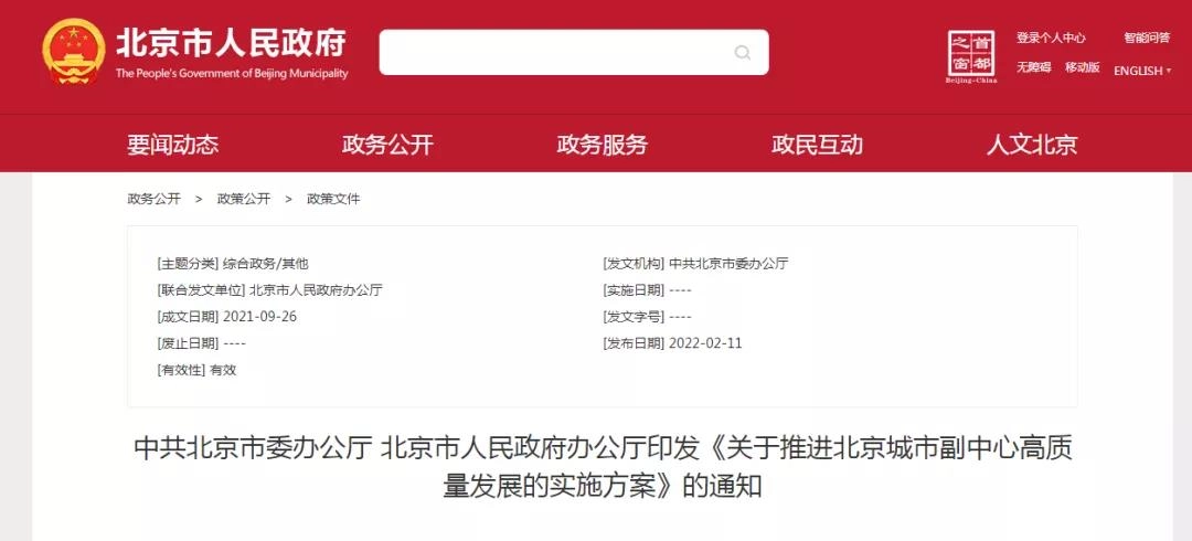 2月11日,北京市人民政府办公厅印发《关于推进北京城市副中心高质量发展的实施方案》的通知。