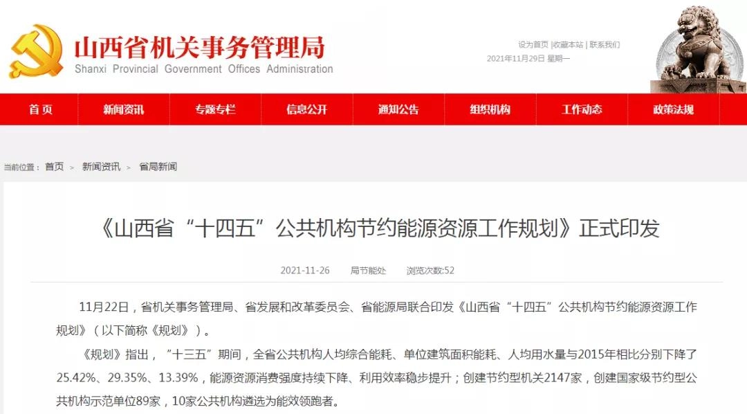 日前,山西省机关事务管理局、省发改委、省能源局日前联合印发《山西省“十四五”公共机构节约能源资源工作规划》(以下简称《规划》)。明确提出,“十四五”期间,山西省实施“十大行动”,助力全省公共机构绿色低碳转型。