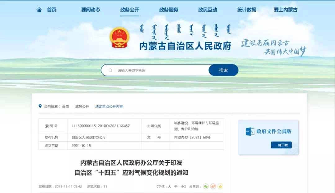 近日,内蒙古自治区人民政府发布内蒙古自治区人民政府办公厅关于印发自治区“十四五”应对气候变化规划的通知。