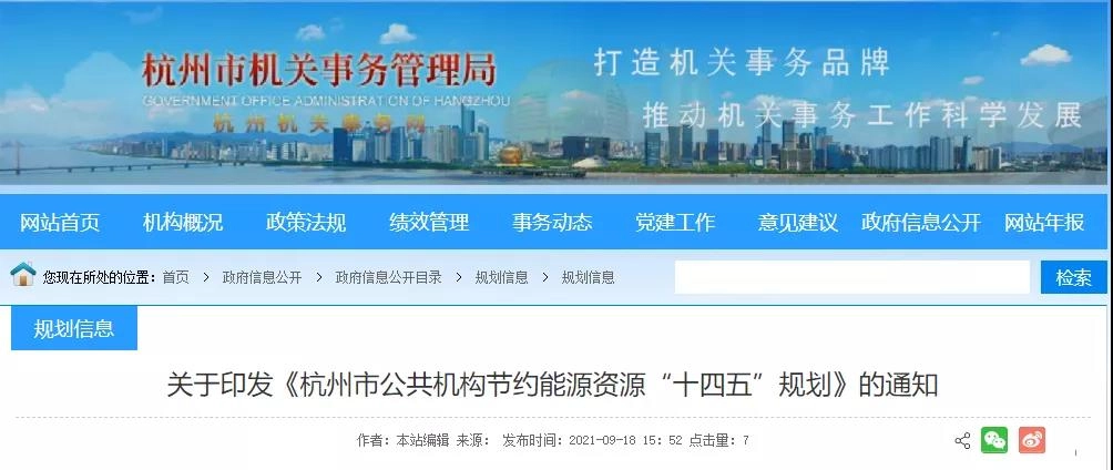 近日,杭州市机关事务管理局印发《杭州市公共机构节约能源资源“十四五”规划》的通知。
