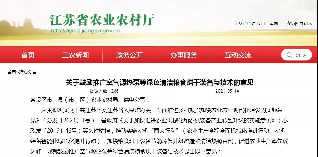 近日,江苏省农业农村厅发布《关于鼓励推广空气源热泵等绿色清洁粮食烘干装备与技术的意见》,(以下简称《意见》)。