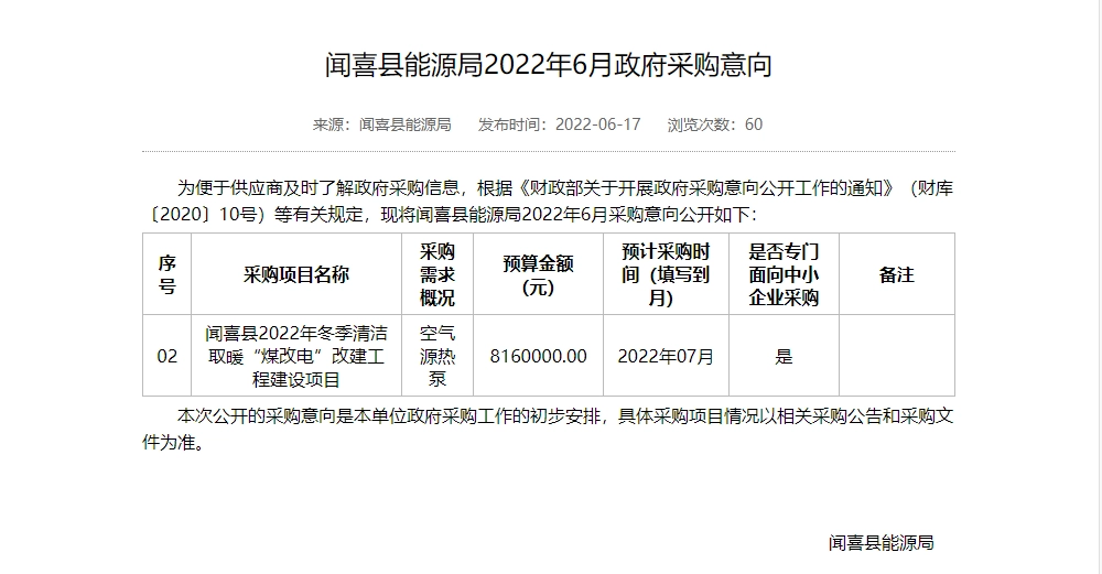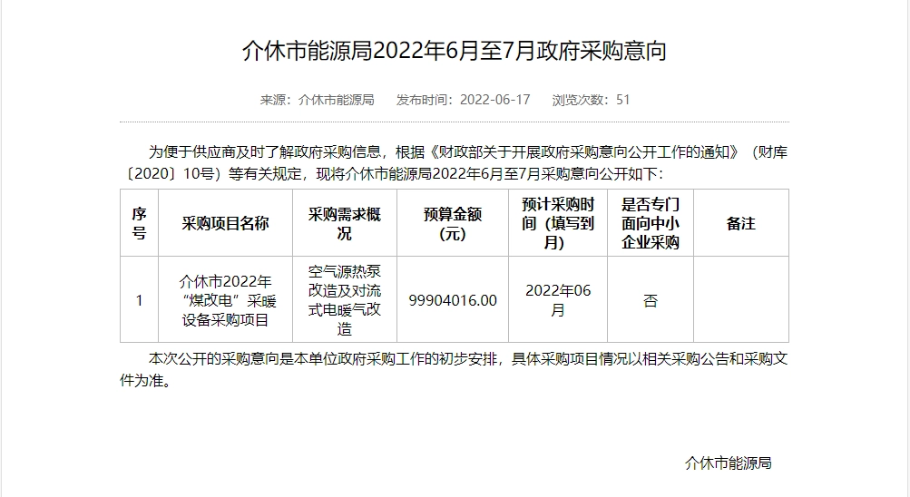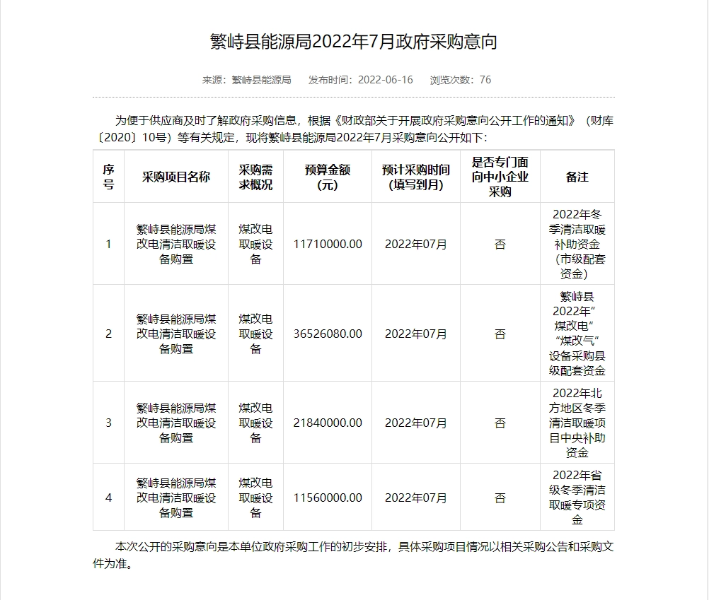 近日,山西省政府采购网发布宁武县、代县、偏关县、保德县、静乐县、定襄县、五台县及五台山风景名胜区、忻州市忻府区、岢岚县、繁峙县、神池县、河曲县、原平市、闻喜县、介休市等共15个市县地区政府煤改电取暖设备采购意向。预算总金额超13.5485万。
