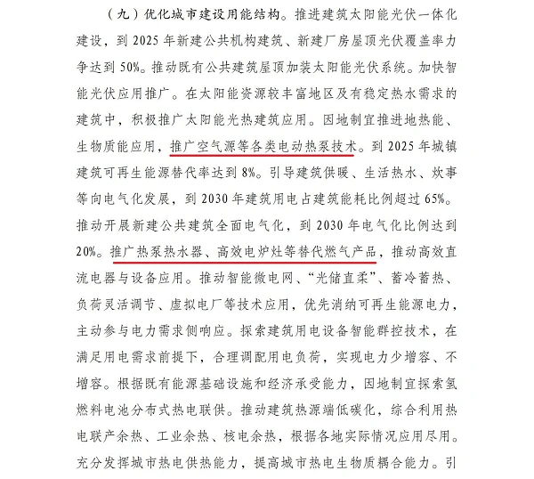 优化城市建设用能结构。推进建筑太阳能光伏一体化建设,到 2025 年新建公共机构建筑、新建厂房屋顶光伏覆盖率力争达到 50%。推动既有公共建筑屋顶加装太阳能光伏系统。加快智能光伏应用推广。在太阳能资源较丰富地区及有稳定热水需求的建筑中,积极推广太阳能光热建筑应用。因地制宜推进地热能、生物质能应用,推广空气源等各类电动热泵技术。到 2025 年城镇建筑可再生能源替代率达到 8%。引导建筑供暖、生活热水、炊事等向电气化发展,到 2030 年建筑用电占建筑能耗比例超过 65%。推动开展新建公共建筑全面电气化,到 2030 年电气化比例达到20%。推广热泵热水器、高效电炉灶等替代燃气产品,推动高效直流电器与设备应用。推动智能微电网、“光储直柔”、蓄冷蓄热、负荷灵活调节、虚拟电厂等技术应用,优先消纳可再生能源电力,主动参与电力需求侧响应。探索建筑用电设备智能群控技术,在满足用电需求前提下,合理调配用电负荷,实现电力少增容、不增容。根据既有能源基础设施和经济承受能力,因地制宜探索氢燃料电池分布式热电联供。推动建筑热源端低碳化,综合利用热电联产余热、工业余热、核电余热,根据各地实际情况应用尽用。充分发挥城市热电供热能力,提高城市热电生物质耦合能力。引导寒冷地区达到超低能耗的建筑不再采用市政集中供暖。