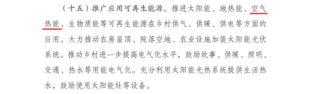 推广应用可再生能源。推进太阳能、地热能、空气热能、生物质能等可再生能源在乡村供气、供暖、供电等方面的应用。大力推动农房屋顶、院落空地、农业设施加装太阳能光伏系统。推动乡村进一步提高电气化水平,鼓励炊事、供暖、照明、交通、热水等用能电气化。充分利用太阳能光热系统提供生活热水,鼓励使用太阳能灶等设备。