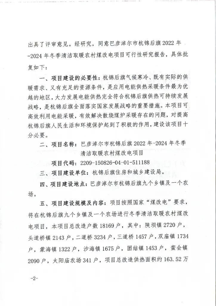 杭锦后旗发展和改革委员会9月21日发布关于巴彦淖尔市杭锦后旗2022年—2024年冬季清洁取暖农村煤改电项目可行性研究报告(以下简称报告)的批复。