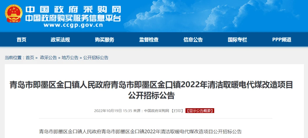 青岛市即墨区金口镇人民政府青岛市即墨区金口镇2022年清洁取暖电代煤改造项目公开招标公告