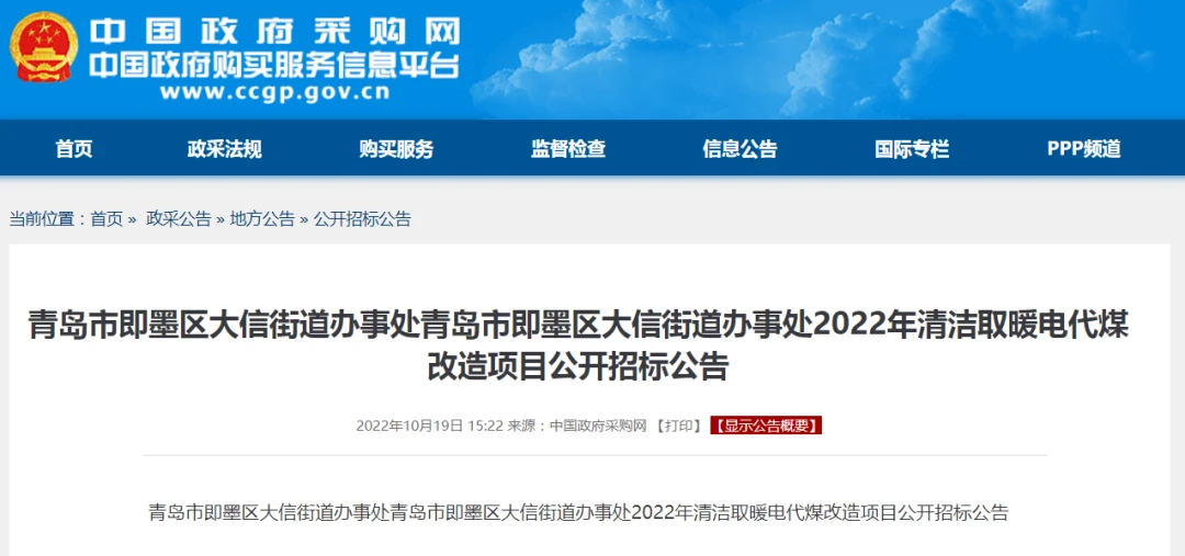 青岛市即墨区大信街道办事处青岛市即墨区大信街道办事处2022年清洁取暖电代煤改造项目公开招标公告