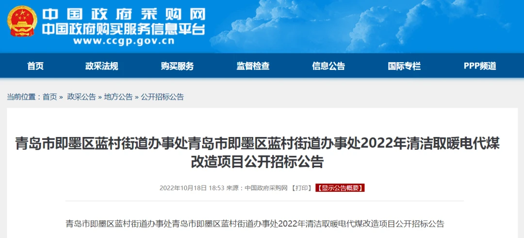 青岛市即墨区蓝村街道办事处青岛市即墨区蓝村街道办事处2022年清洁取暖电代煤改造项目公开招标公告