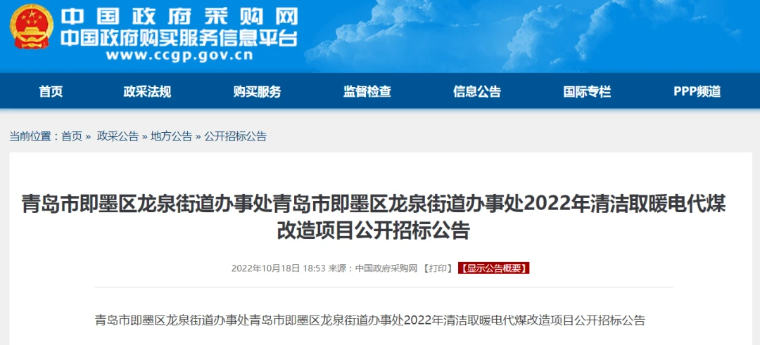青岛市即墨区龙泉街道办事处青岛市即墨区龙泉街道办事处2022年清洁取暖电代煤改造项目公开招标公告