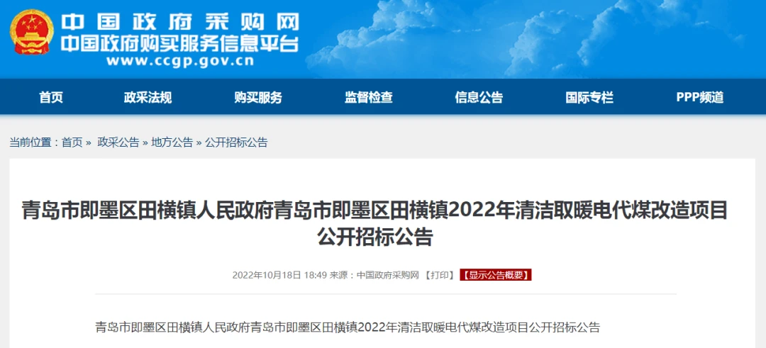 青岛市即墨区田横镇人民政府青岛市即墨区田横镇2022年清洁取暖电代煤改造项目公开招标公告