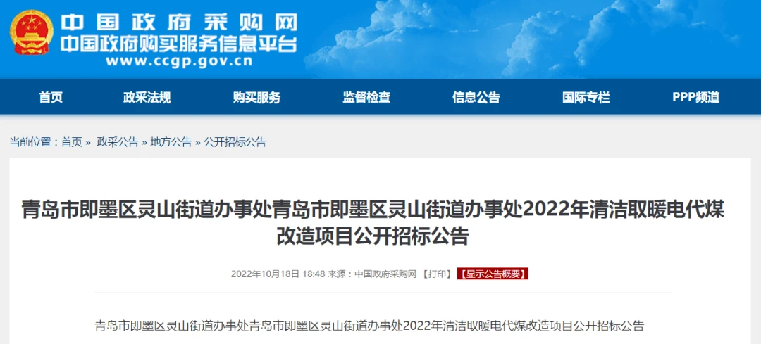 青岛市即墨区灵山街道办事处青岛市即墨区灵山街道办事处2022年清洁取暖电代煤改造项目公开招标公告