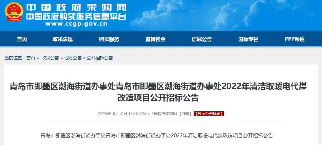青岛市即墨区潮海街道办事处青岛市即墨区潮海街道办事处2022年清洁取暖电代煤改造项目公开招标公告