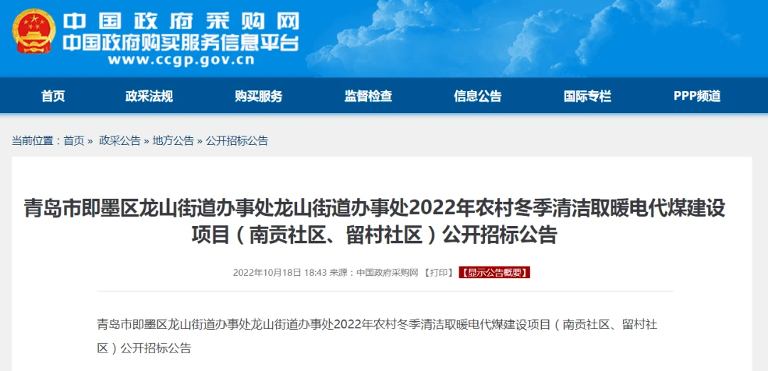 青岛市即墨区龙山街道办事处龙山街道办事处2022年农村冬季清洁取暖电代煤建设项目(南贡社区、留村社区)公开招标公告