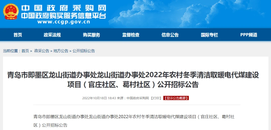 青岛市即墨区龙山街道办事处龙山街道办事处2022年农村冬季清洁取暖电代煤建设项目(官庄社区、葛村社区)公开招标公告