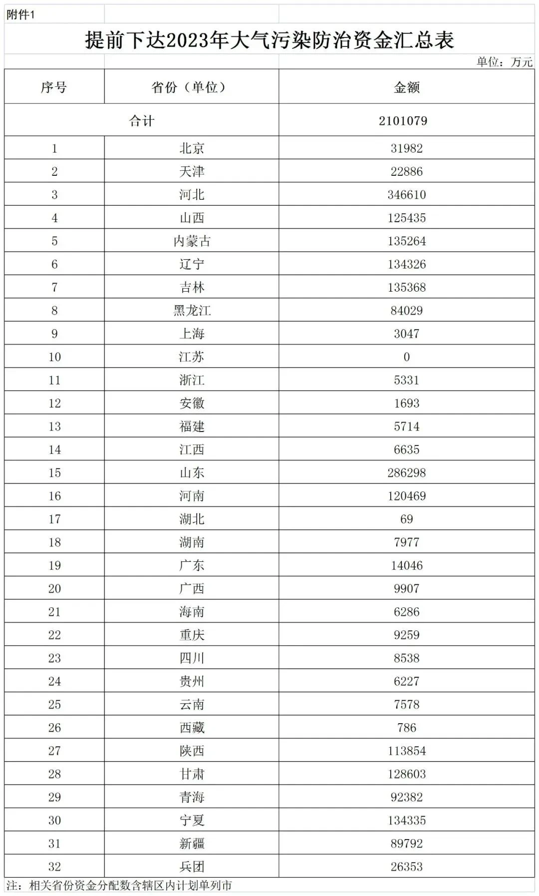 根据通知内容显示,本年度共下达2023年大气污染防治资金210.1079亿元,其中,北京31982万元、天津22886万元、河北346610万元,山西125435万元、内蒙古135264万元、辽宁134326万元、吉林135368万元、黑龙江84029万元、上海3047万元、浙江5331万元、安徽1693万元、福建5714万元、江西6635万元、山东286298万元、河南120469万元、湖北69万元、湖南7977万元、广东14046万元、广西9907万元、海南6286万元、重庆9259万元、四川8538万元、贵州6227万元、云南7578万元、西藏786万元、陕西113854万元、甘肃128603万元、青海92382万元、宁夏134335万元、新疆89792万元、兵团26353万元。