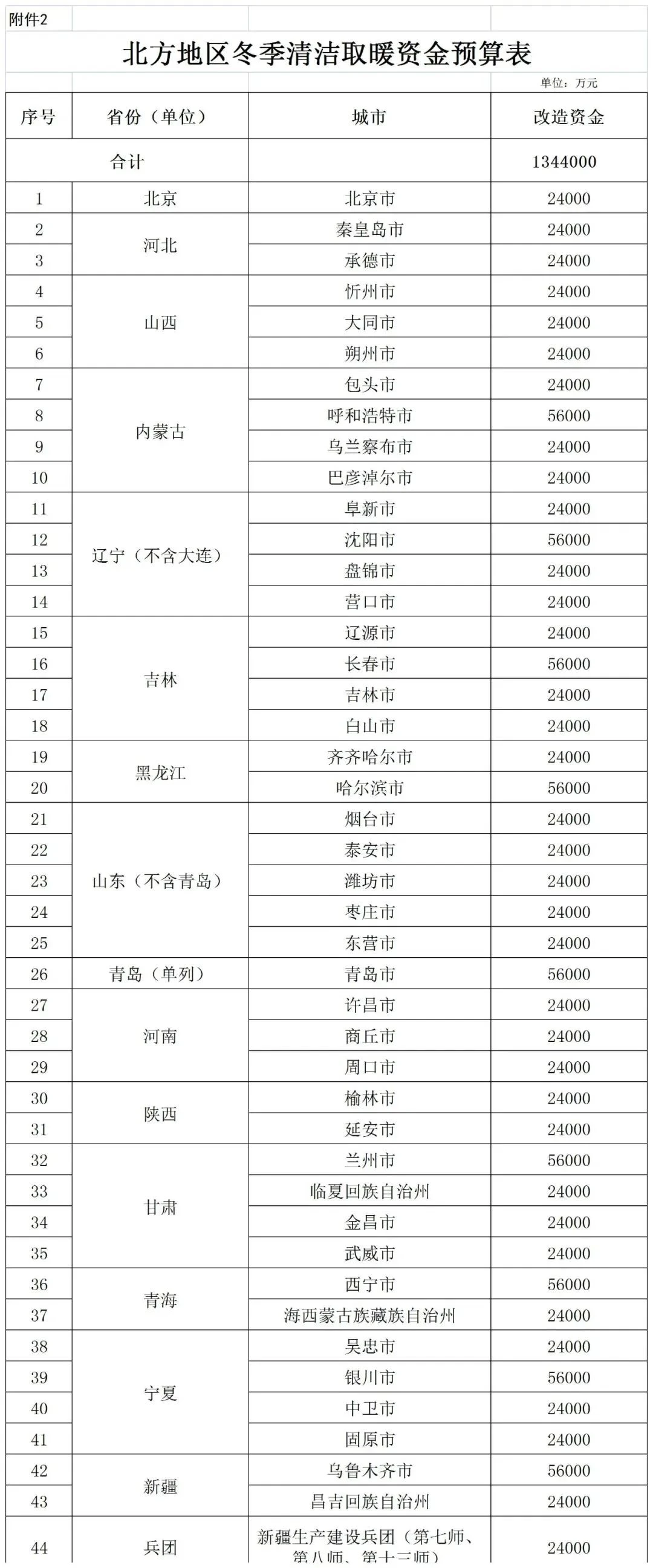 其中,北方地区冬季清洁取暖资金额度134.4亿。北京市24000万元、河北省秦皇岛市24000万元、承德市24000万元,山西忻州市24000万元、大同市24000万元、朔州市24000万元、内蒙古包头市24000万元、呼和浩特市56000万元、乌兰察布市24000万元、巴彦淖尔市24000万元,辽宁(不含大连)阜新市24000万元、沈阳市56000万元、盘锦市24000万元、营口市24000万元,吉林辽源市24000万元、长春市56000万元、吉林市24000万元、白山市24000万元,黑龙江 齐齐哈尔24000万元、哈尔滨市56000万元,山东(不含青岛)烟台市24000万元、泰安市24000万元、潍坊市24000万元、枣庄市24000万元、东营市24000万元、青岛(单列)青岛市56000万元,河南许昌市24000万元、商丘市24000万元、周口市24000万元,陕西榆林市24000万元、延安市24000万元,甘肃兰州市56000万元,临夏回族自治州24000万元、金昌市24000万元、武威市24000万元,青海西宁市56000万元、海西蒙古族藏族自治州24000万元、宁夏吴忠市24000万元、银川市56000万元、中卫市24000万元、固原市24000万元、新疆乌鲁木齐市56000万元、昌吉回族自治州24000万元,兵团新疆生产建设兵团(第七师、第八师、第十三师)24000万元。