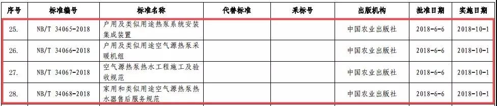近日,国家能源局发布2018年第8号公告,由中国节能协会组织起草的《户用及类似用途热泵系统安装集成装置》(标准号:NB/T 34065-2018)、《户用及类似用途空气源热泵采暖机组》(标准号:NB/T 34066-2018)、《空气源热泵热水工程施工及验收规范》(标准号:NB/T 34067-2018)、《家用和类似用途空气源热泵热水器售后服务规范》(标准号:NB/T 34068-2018)等四项标准正式批准发布,将于2018年10月1日实施。