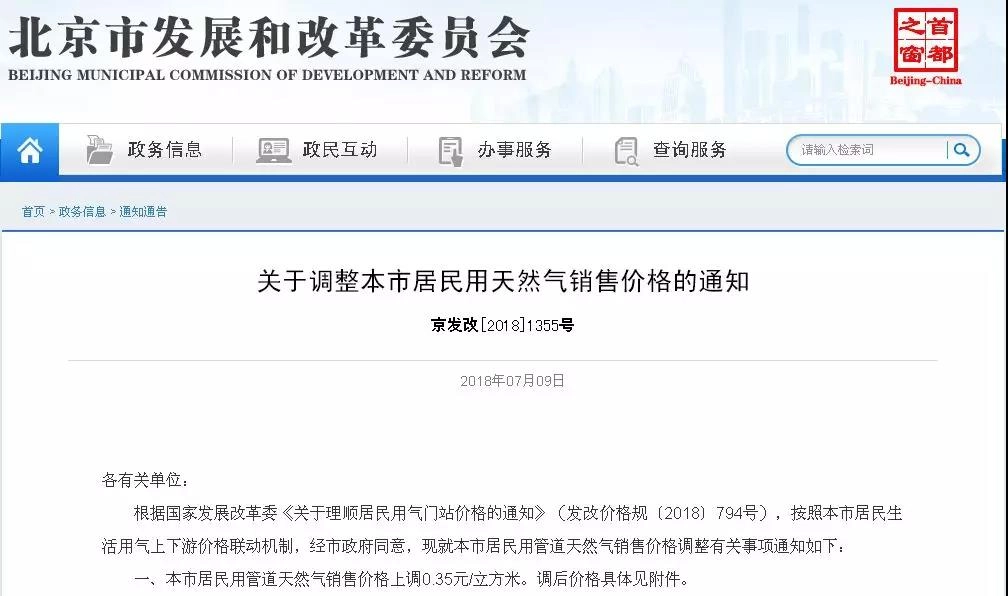 另据新京报记者从北京市发改委了解到,北京自7月10日起,居民用气每立方米将上调0.35元。对于居民分户自采暖用户,此次居民用气价格调整后,补贴标准也相应上调0.35元/立方米。农村“煤改气”用户享受相同的补贴政策。