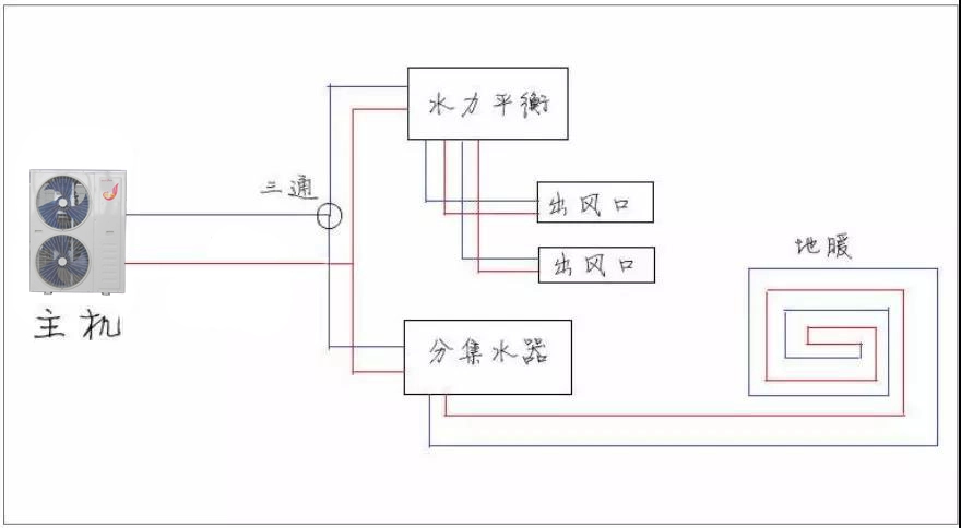 图2是常规的空气源热泵二联供系统,有人也称之为第四代中央空调,也就是加了地暖。大家都知道,空气源热泵可以连接多种末端,地暖、风盘或者暖气片,其实中央空调也是一样的,但是传统的空调连接的是风盘,其作用也就是空气调节,地暖严格来说不属于中央空调的范畴。