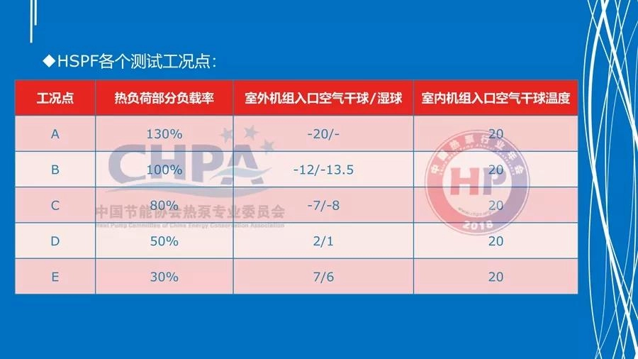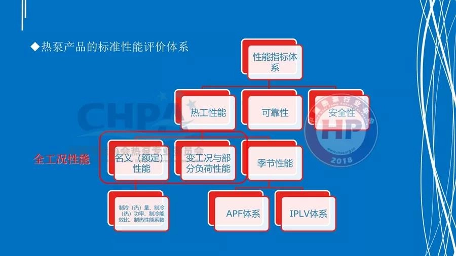 热泵产品的指标体系性能可分为热工性能、可靠性、安全性;热工性能包括名义性能,变工况与部分负荷性能,季节性能,现在所讲的APF体系,HSPF相当于体系里面全年能效,四个工况点IPLV负荷。